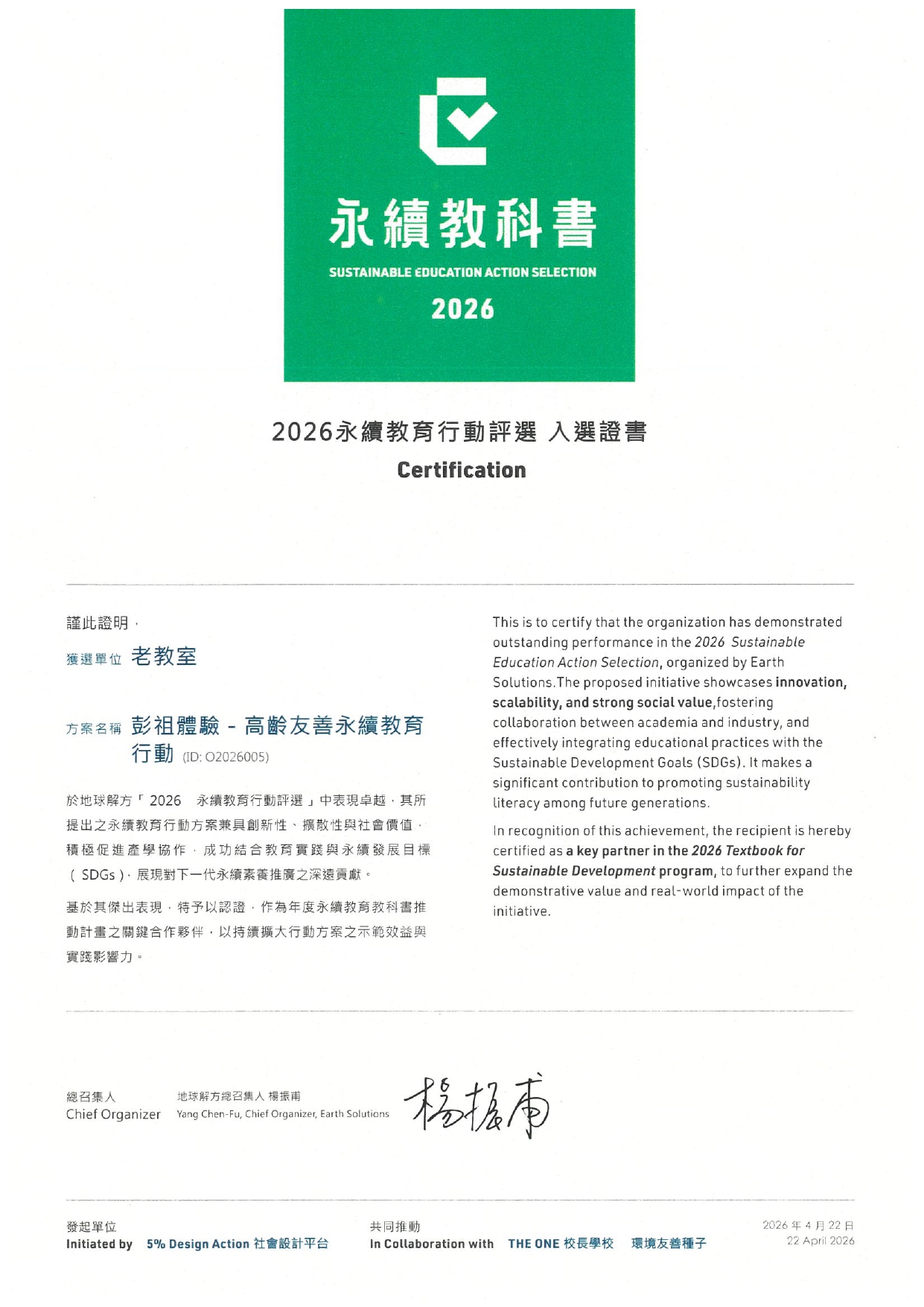 今年,老教室以「彭祖體驗-高齡友善永續教育行動」,獲選由 5% Design Action 主辦的「2026永續教育行動評選」,並同時獲頒永續教科書「2026永續SELECT」標章,成為該年度永續教育行動楷模。這份榮耀對我們而言,不只是一次被看見的機會,更像是一段長期耕耘高齡體驗教育的回應與鼓勵。回頭看,老教室一路走來,我們始終在思考一件事:教育,是否能成為連結世代、回應社會問題的一種力量?