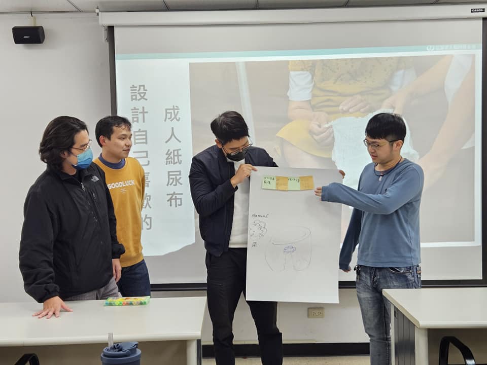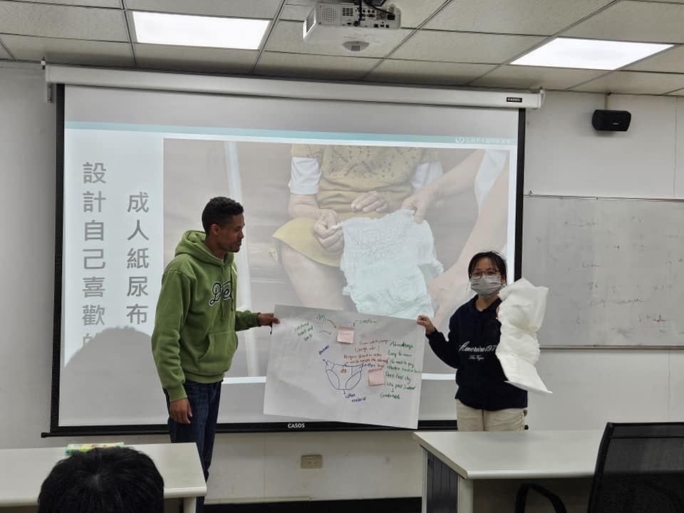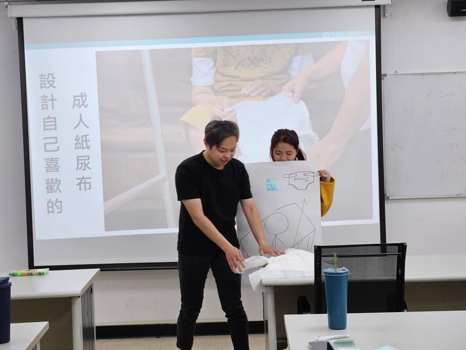 有趣的是,雖然同學分成不同組別,但大家一致認為紙尿布的操作困難點亟待改良,因而提出了許多創意十足的設計方案。有的組從材質著手,提升吸水性;有的組設計尿布輔助架,幫助長輩輕鬆穿脫;甚至還有人提出加入顯示裝置、並以內褲形式呈現的輕薄新型尿布。教室裡充滿笑聲、交流與創新思維,也讓我們看見未來高齡產品的無限可能。