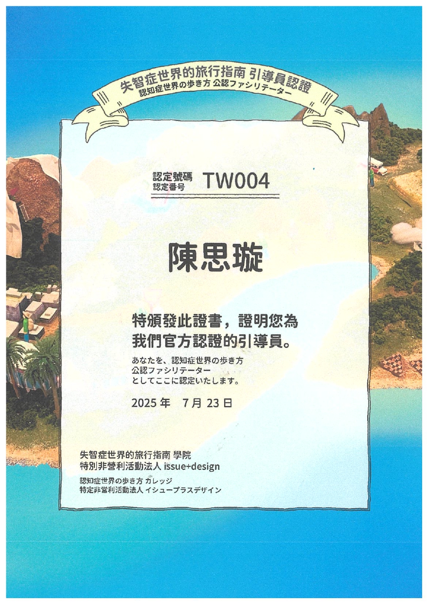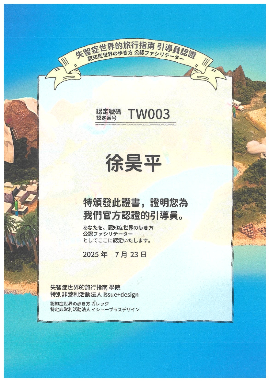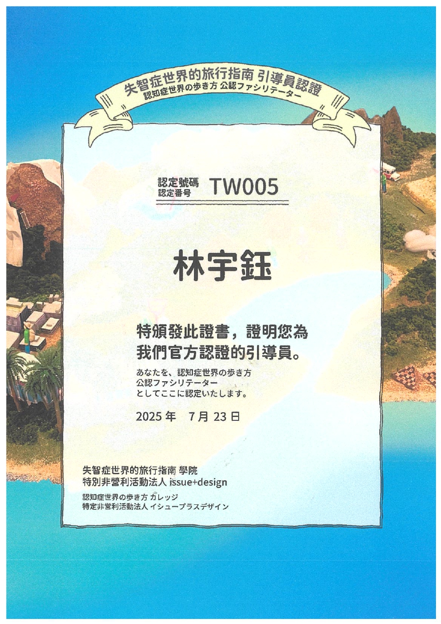 本課程老教室的講師皆通過日本Issue+Design引導員官方認證,並授權使用《失智症世界旅遊指南》繁體中文版實用工作坊之相關教材。非日本官方認證講師不得於臺灣地區使用該教材自行授課。